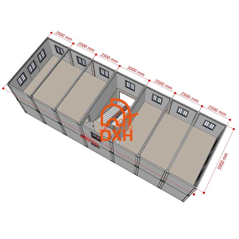 DXH House's two-story modular classroom building represents the future direction of educational infrastructure. This spacious building measures 18,060 mm x 5,950 mm. The modular building accommodates multiple classroom spaces and features a central staircase connecting the floors and linking to restrooms for easy access between levels. This prefabricated solution and modular design ensure maximum safety and durability while enabling rapid and efficient deployment. This modular two-story building is an efficient and convenient solution for schools, training centers, and educational institutions, combining practicality with modern aesthetics.